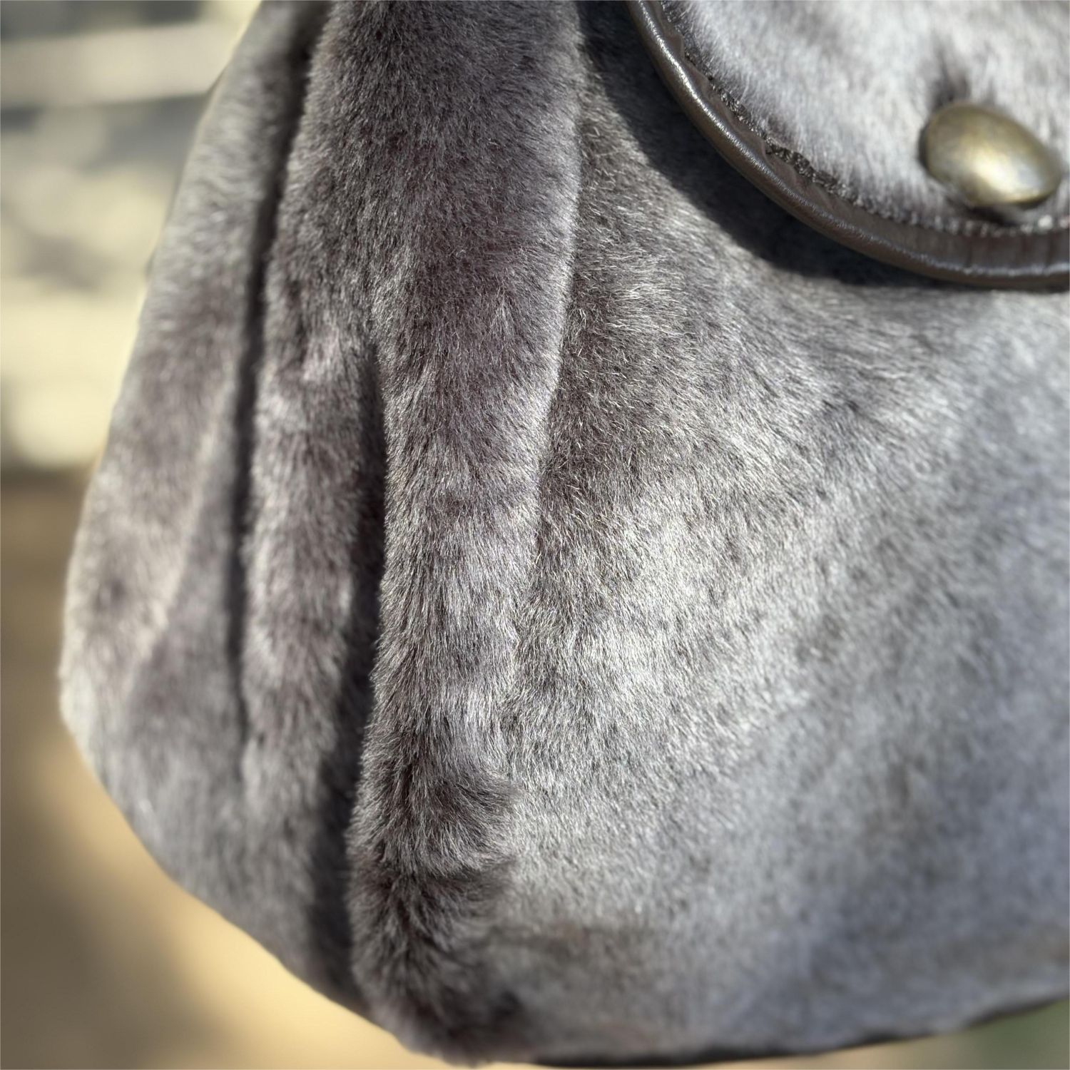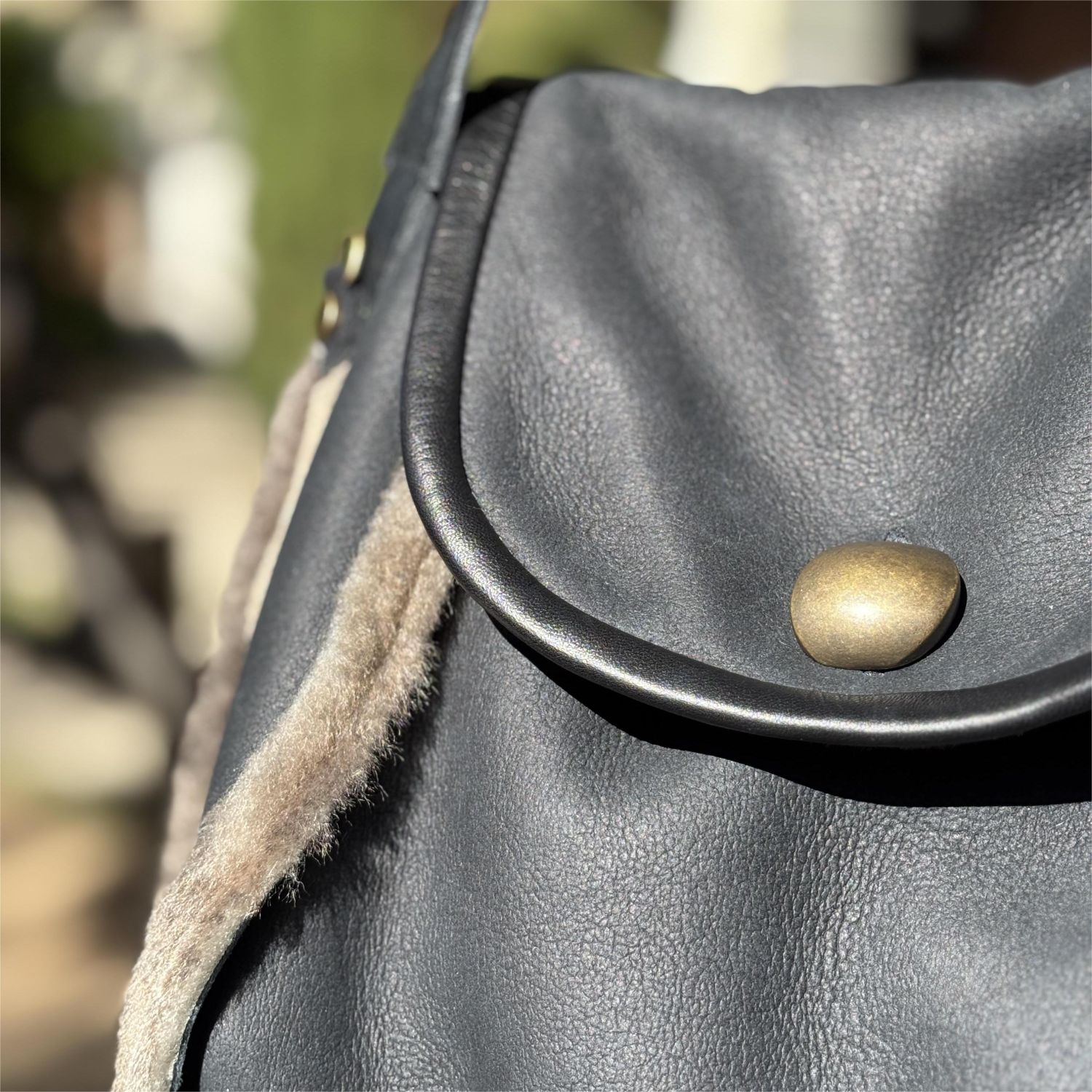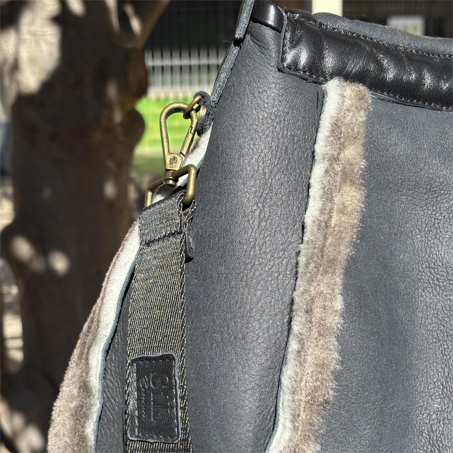 Dos bolsos en uno. Por un lado, tenemos la cara napaland en piel, color negro y por otro lado un suave mouton tono gris marrón. Cierre con tapa y botón a ambos lados. Base de napa en ambos lados.