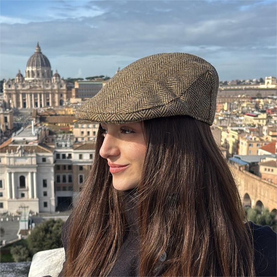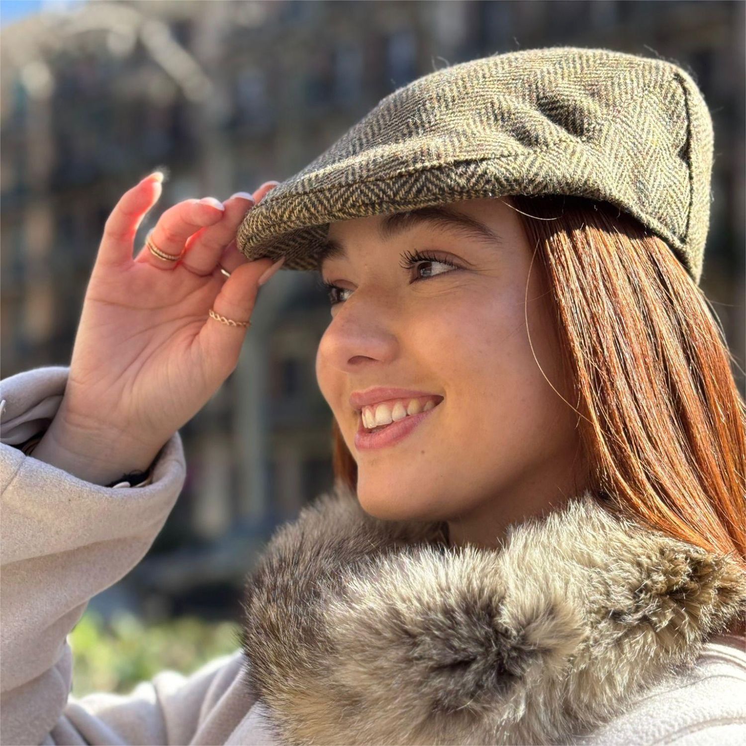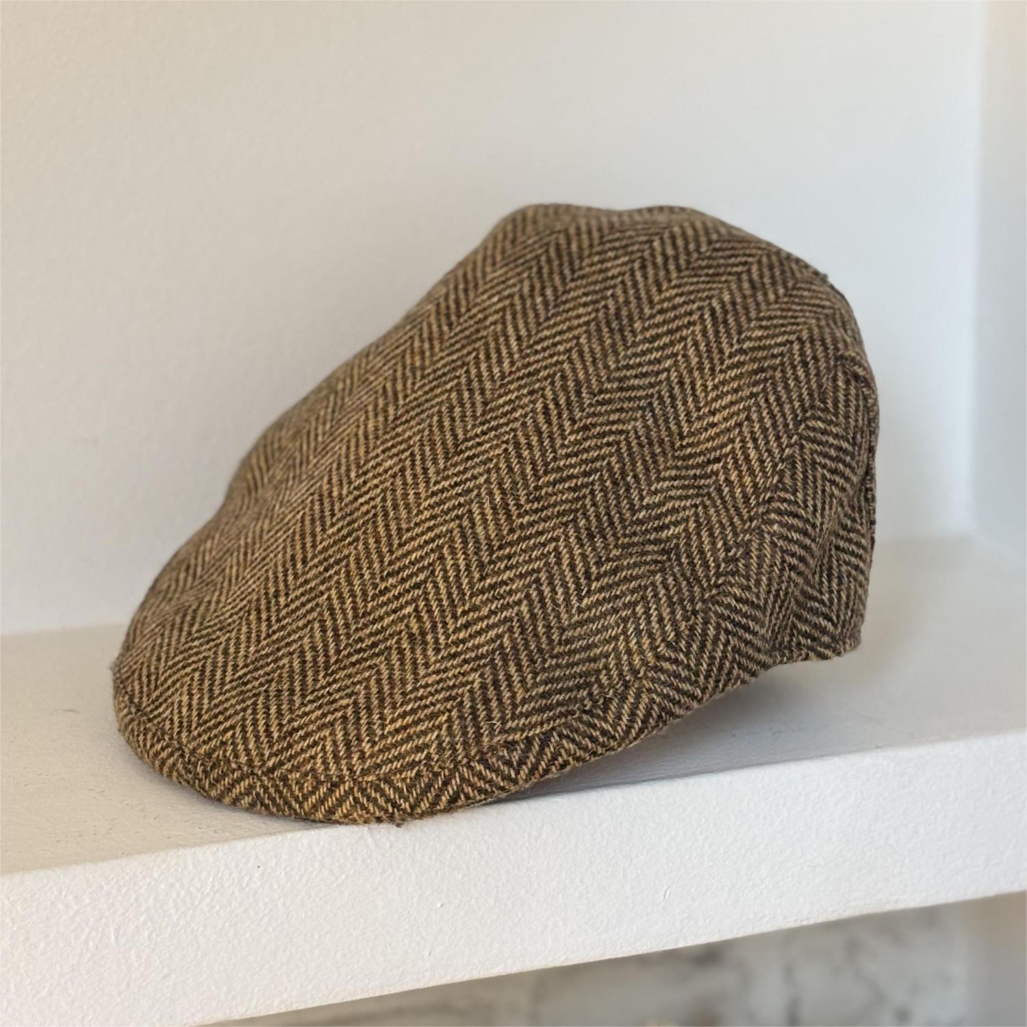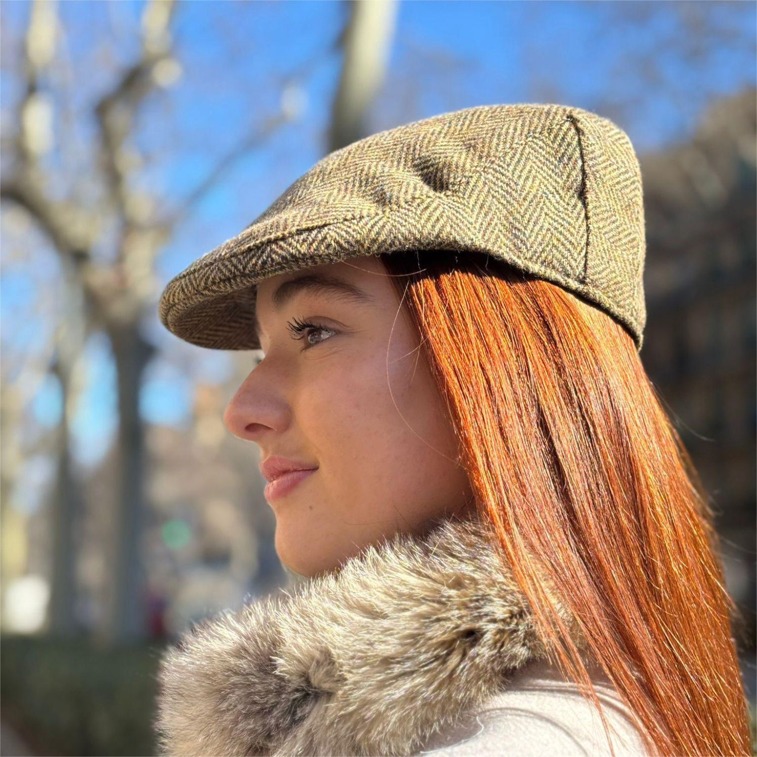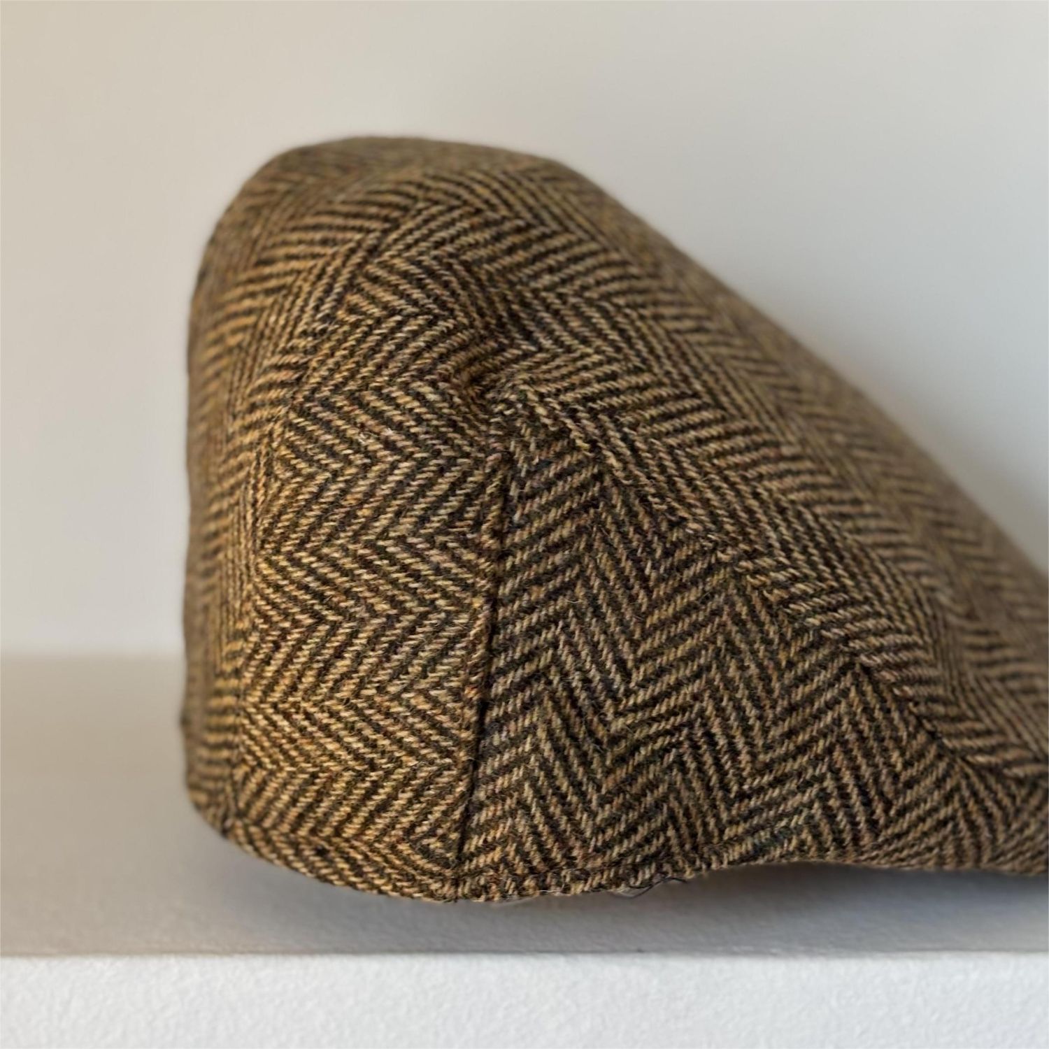 Gorra tipo bullet confeccionada en tejido de lana 100%. Dibujo en espiga color caramelo. Forro de viscosa y refuerzo en visera. Disponible en varias tallas. Hecha íntegramente en España.